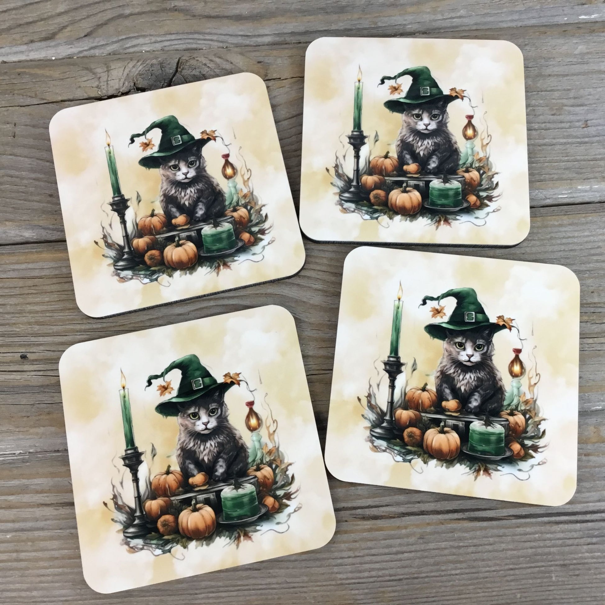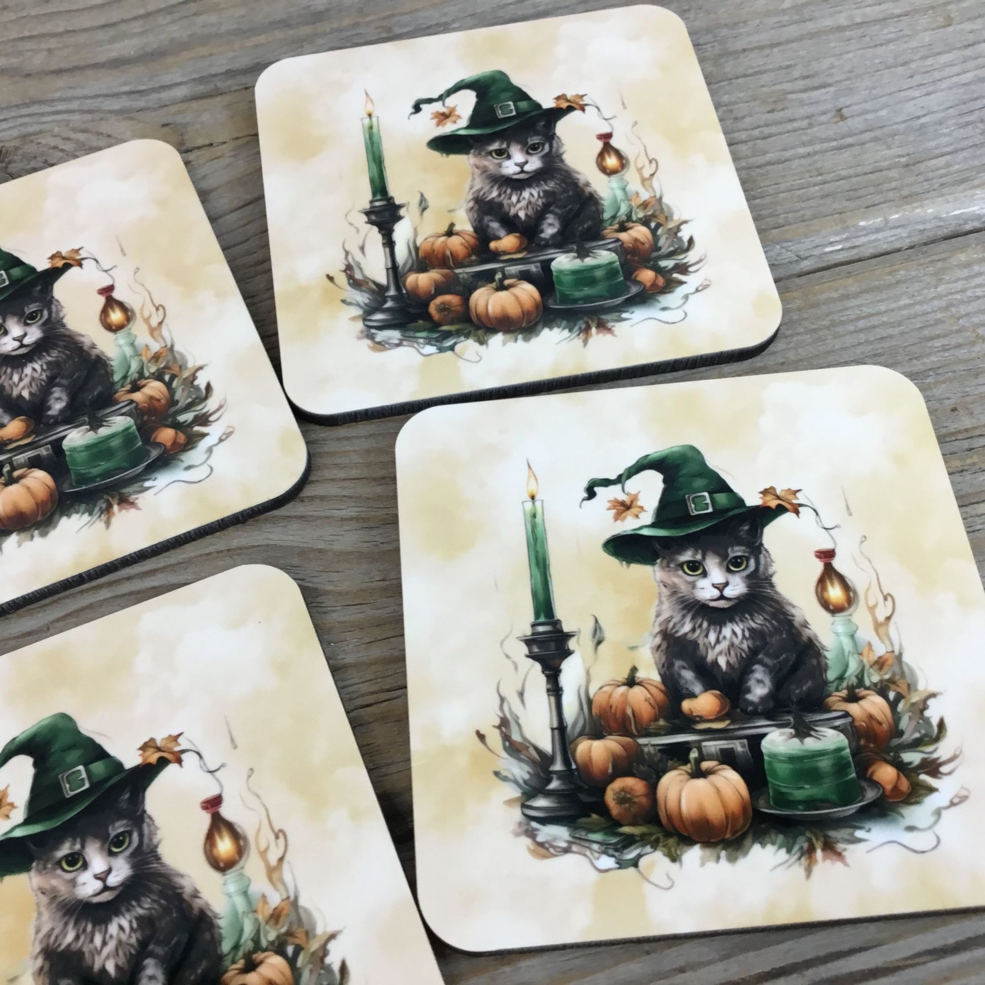 A mischievous cat donning a whimsical witch hat, accompanied by a spellbinding book of enchantments, flickering candles, and charming pumpkins to help you enjoy the magic, on this set of 4 hardboard drink coasters.