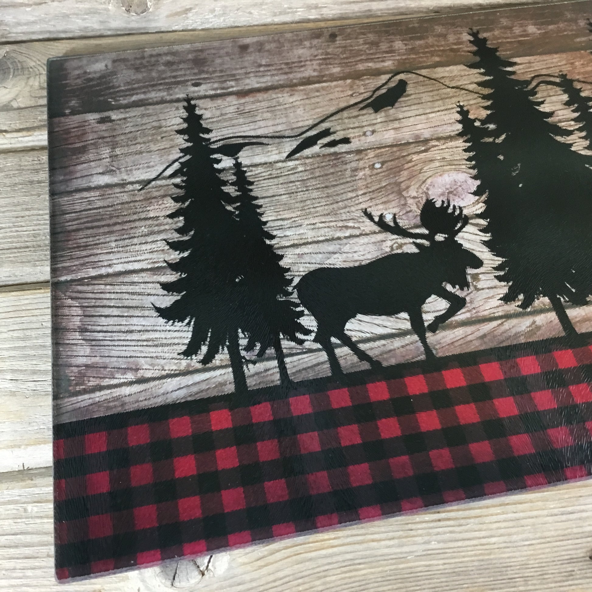 Moose walking through the pine trees with buffalo plaid trim with a rustic wood background on this glass cutting board. Can be customized to add a name or Merry Christmas, Happy Holiday's etc. If no name is specified it will be shipped without one.