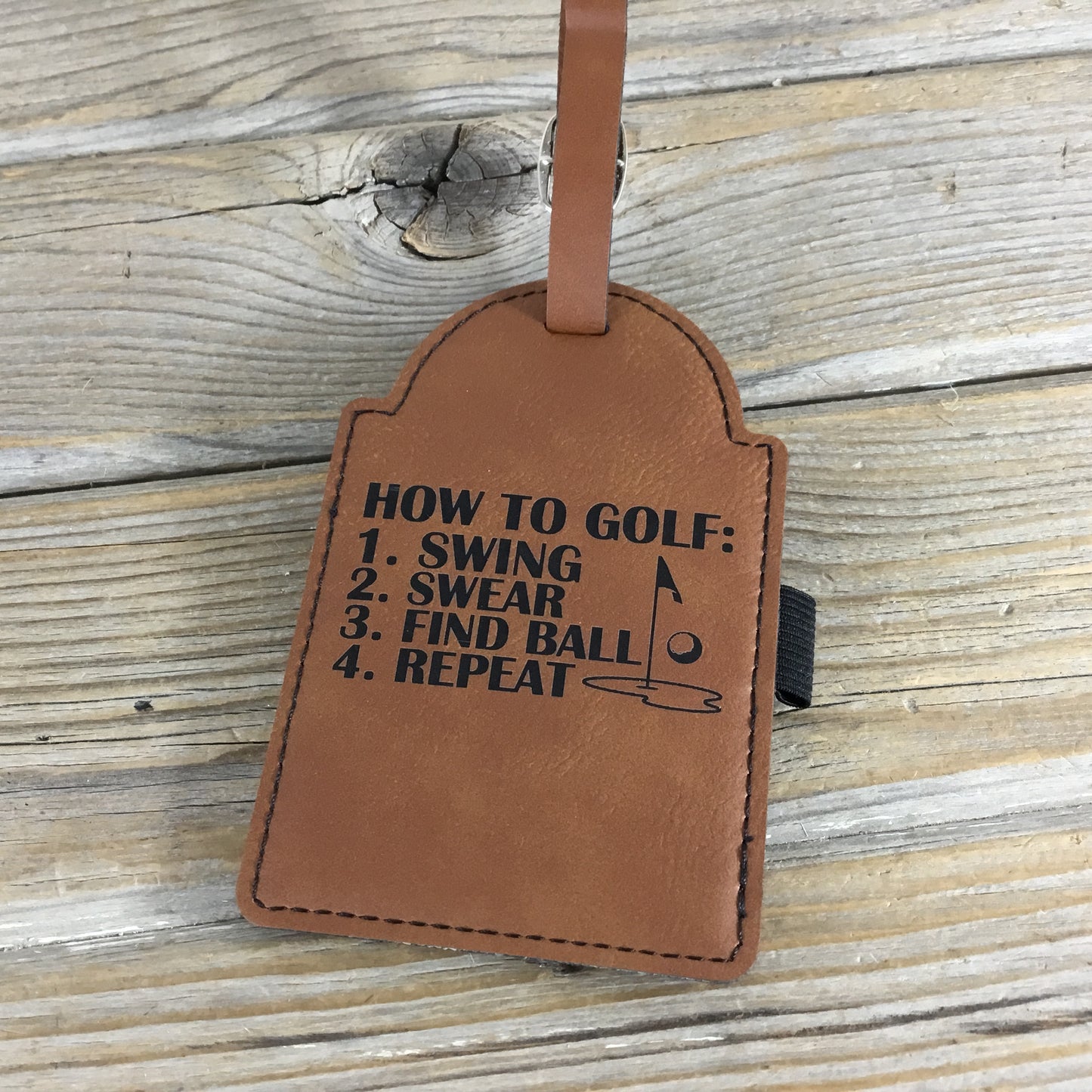 Add some humor to your golf game with the How to Golf Bag Tag. Featuring a fun step-by-step guide to every round, this leatherette tag measures 5" x 3 1/4" and includes three tees, making it a perfect addition to any golf bag.