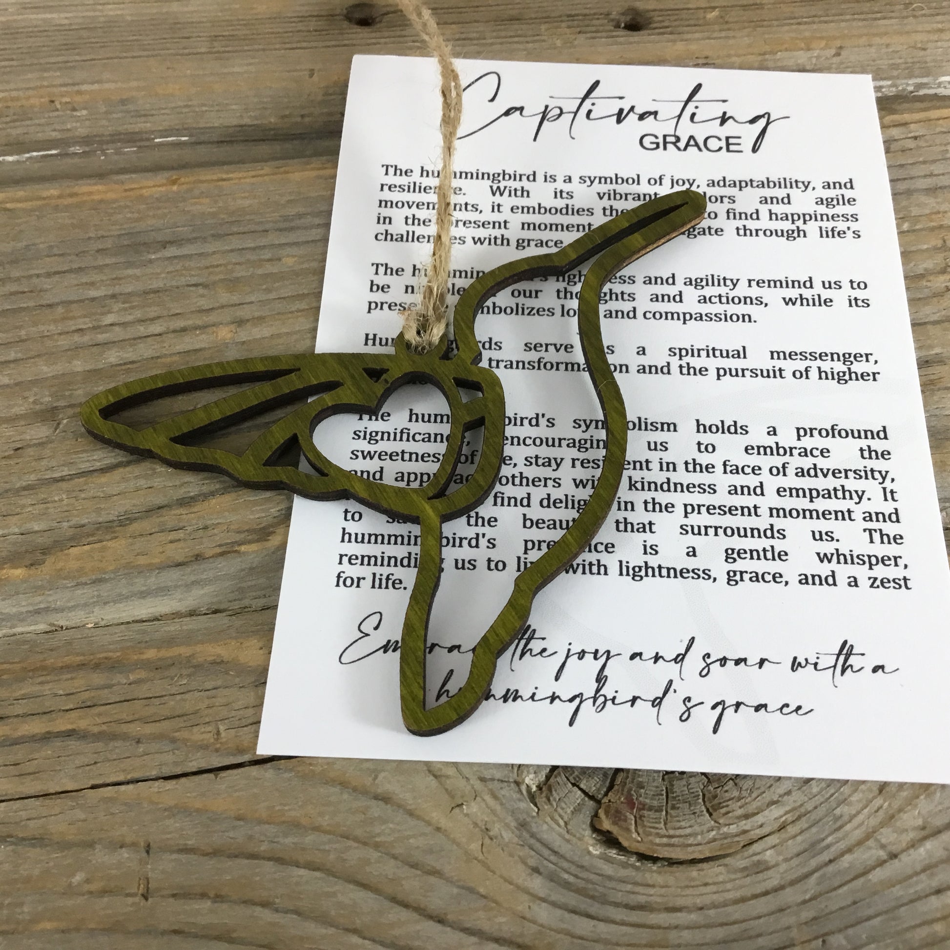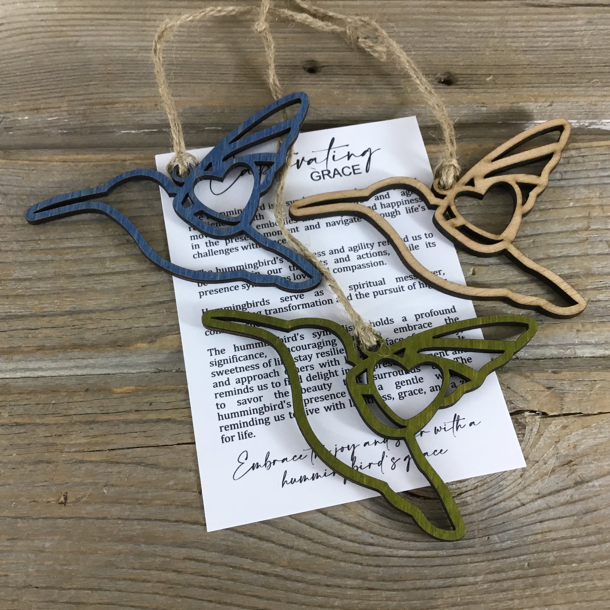 Add elegance to your holiday décor with the Hummingbird Story Card Ornament. This beautiful ornament is laser cut from either unfinished cherry wood, green finished wood or blue finished wood, measuring 4.25" wide by 3" tall.