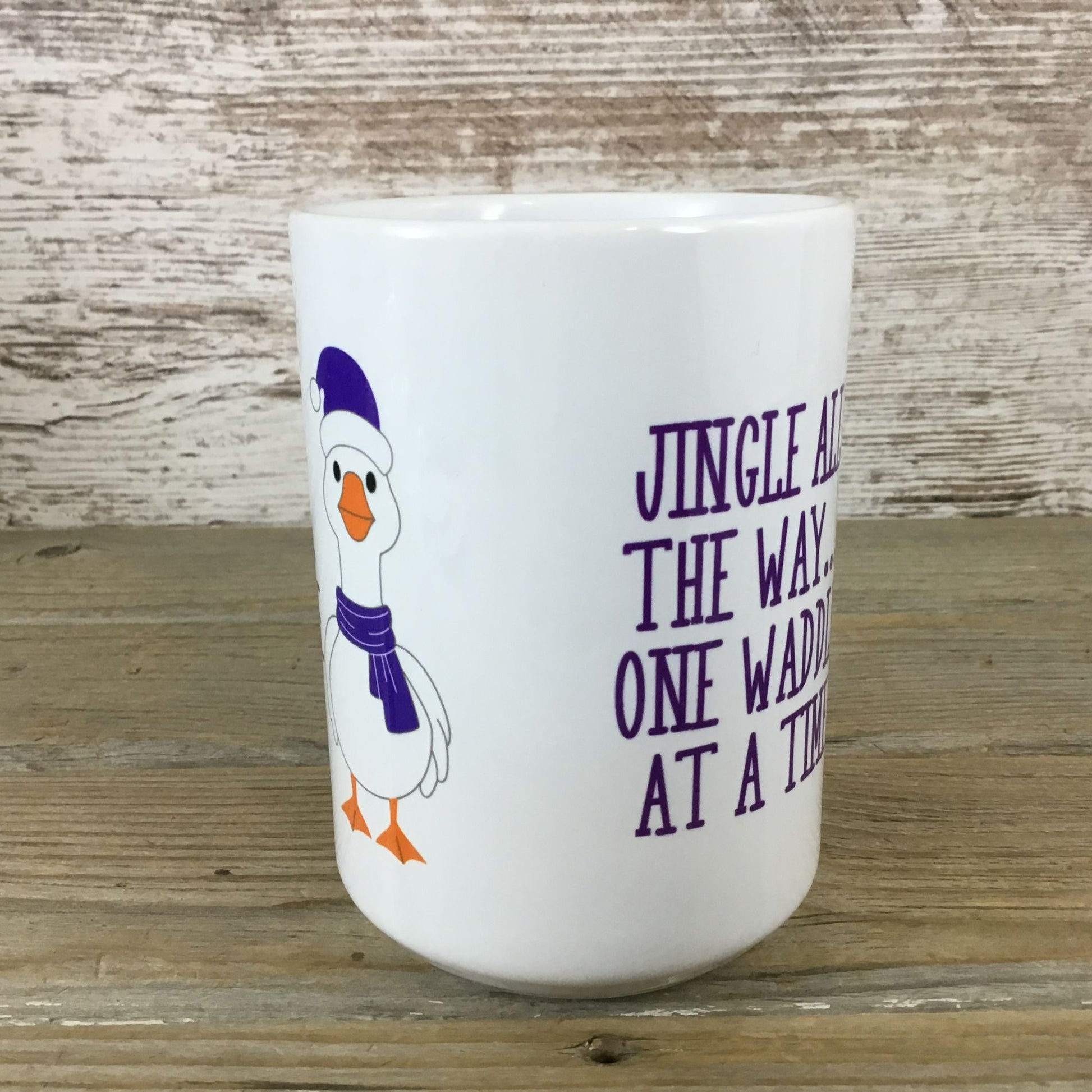Make your holidays brighter with a little goose humor! This 15 oz ceramic mug features a bundled-up goose with “Jingle all the way… One Waddle at a time.” Printed on both sides.