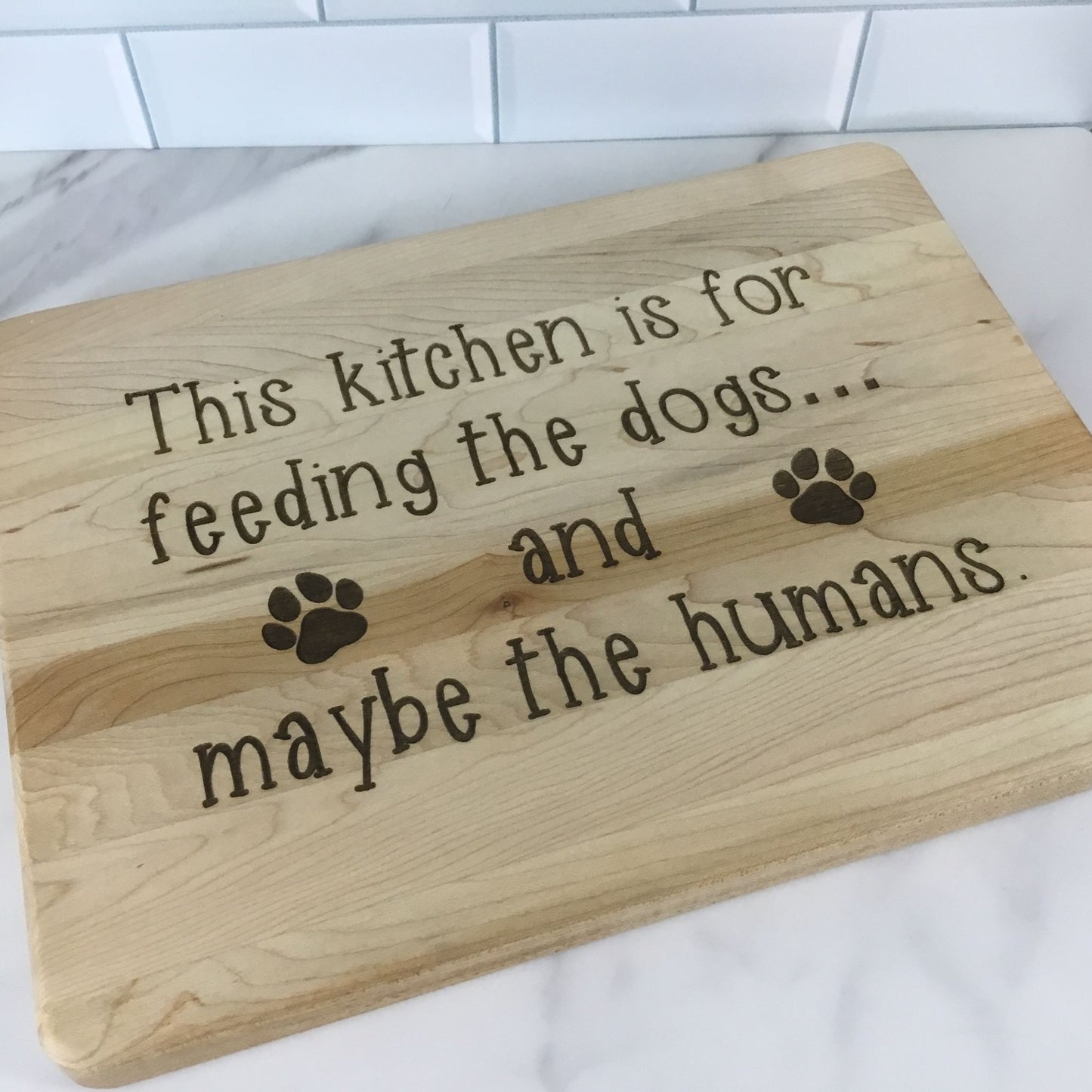 “This kitchen is for feeding the dogs... and maybe the humans” with two paw prints. A great gift for dog families or a humorous addition to your own kitchen space.Measuring 11.5" x 8.75" x 0.5", this maple paddle-style cutting board includes a drip ring and a laser engraving on the back. The design placement means the front is fully usable without affecting the artwork.