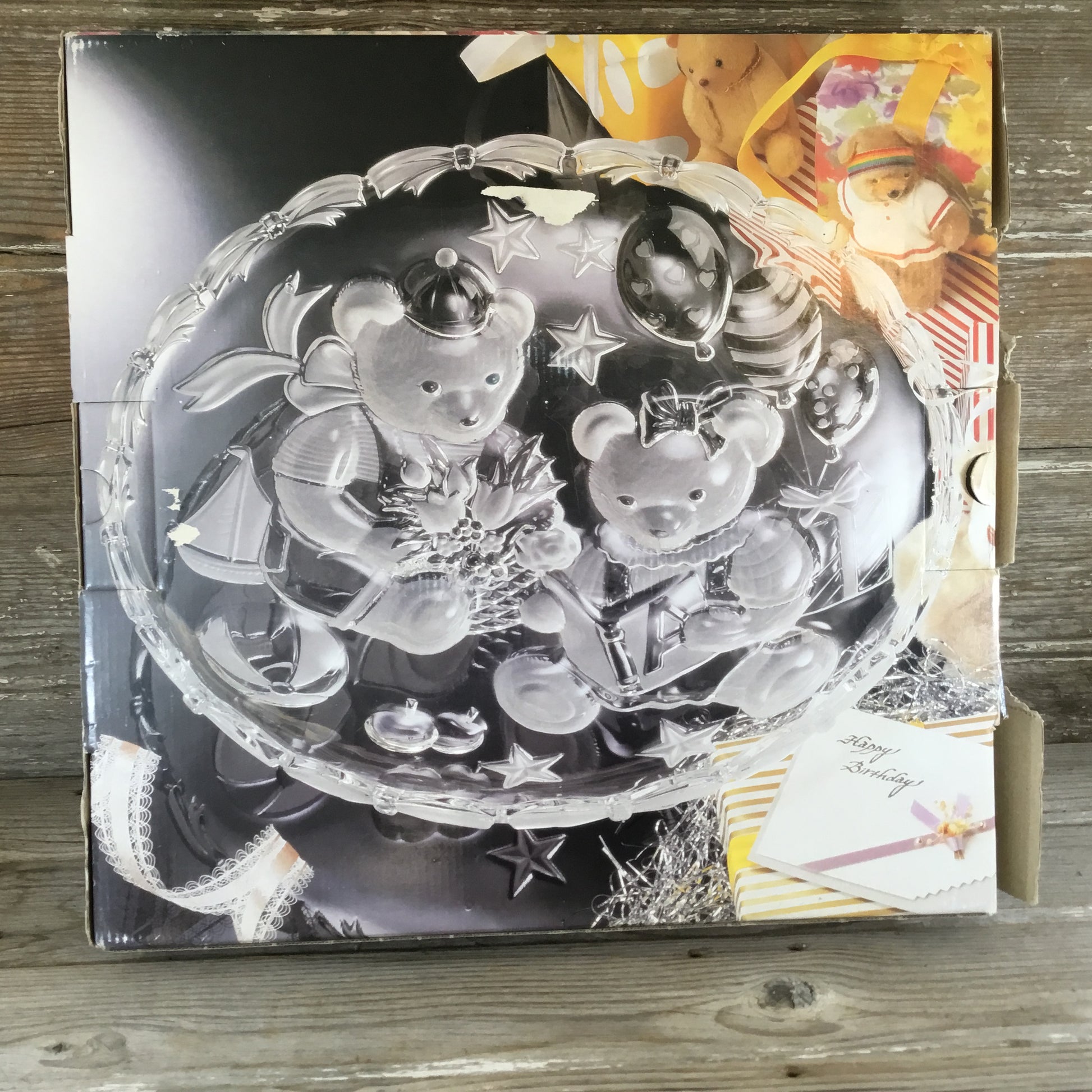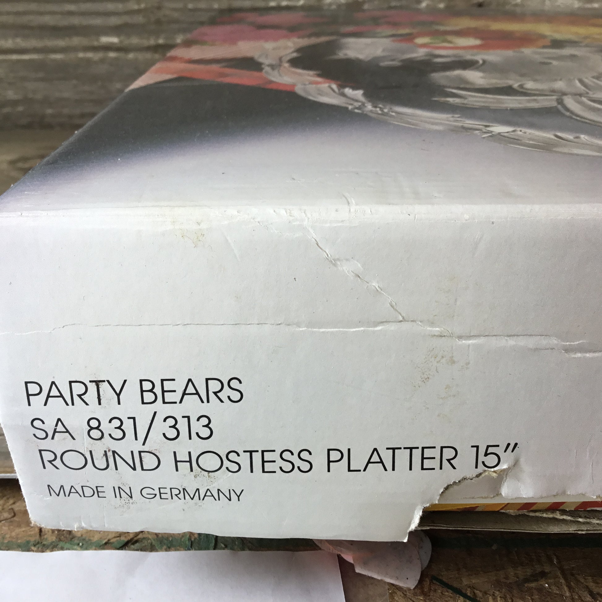 Mikasa Party Bears 15" Embossed Frosted Round Hostess Platter with Original Box! This vintage plate is a must-have for any party enthusiast or collector. With its charming design featuring adorable party bears, it adds a touch of whimsy and nostalgia to your hosting experience.