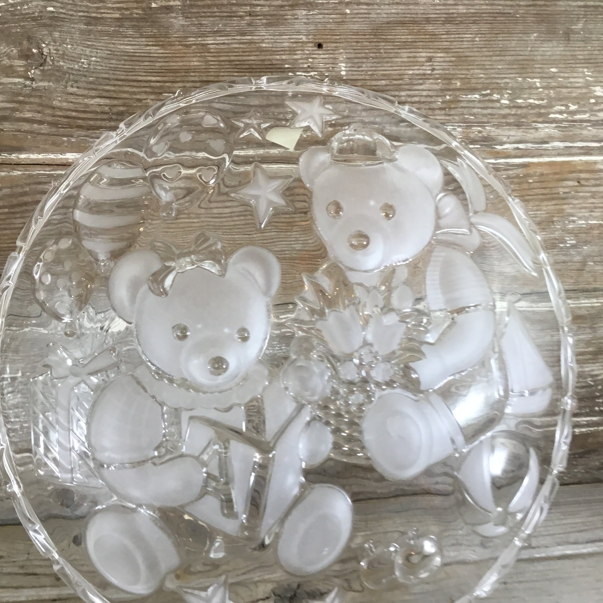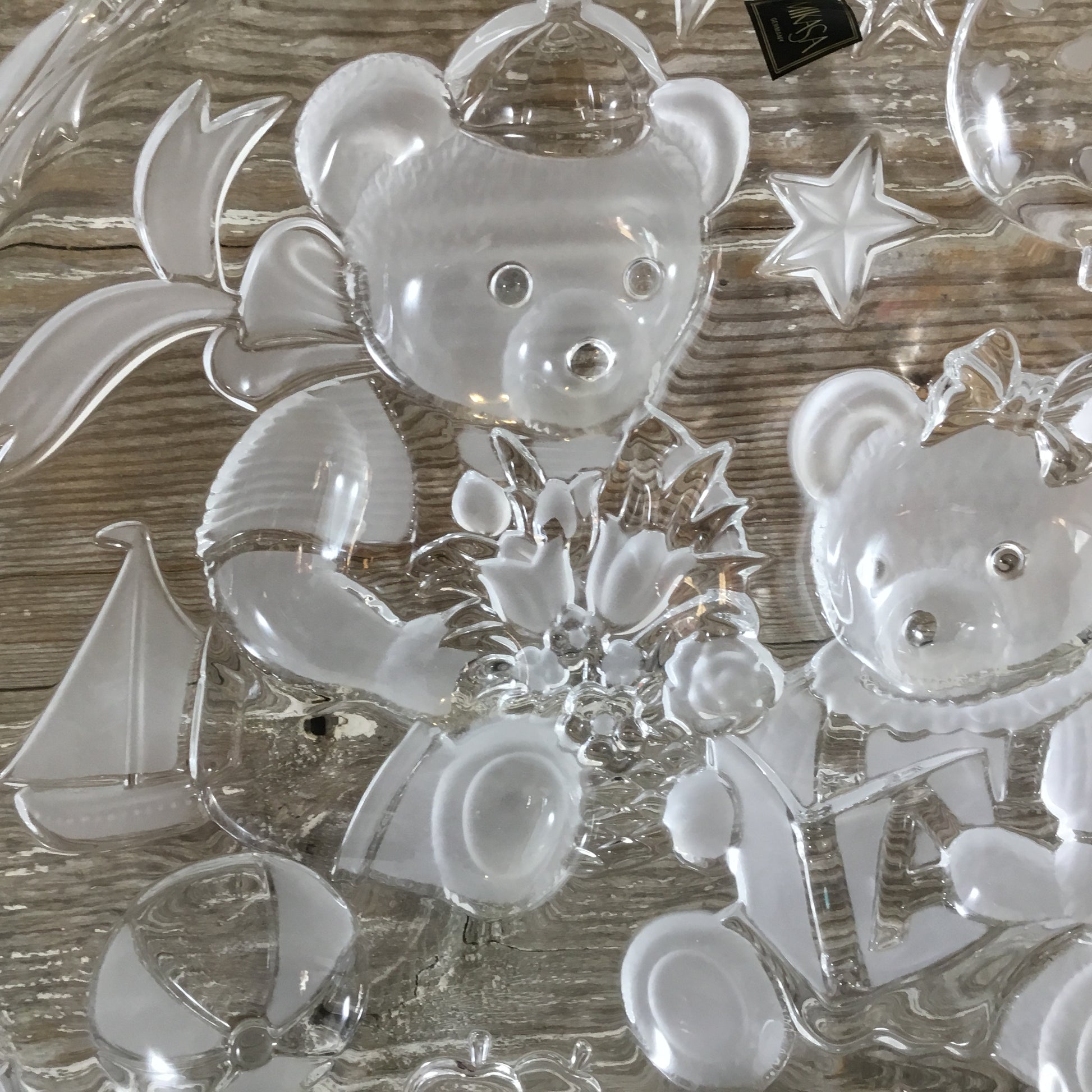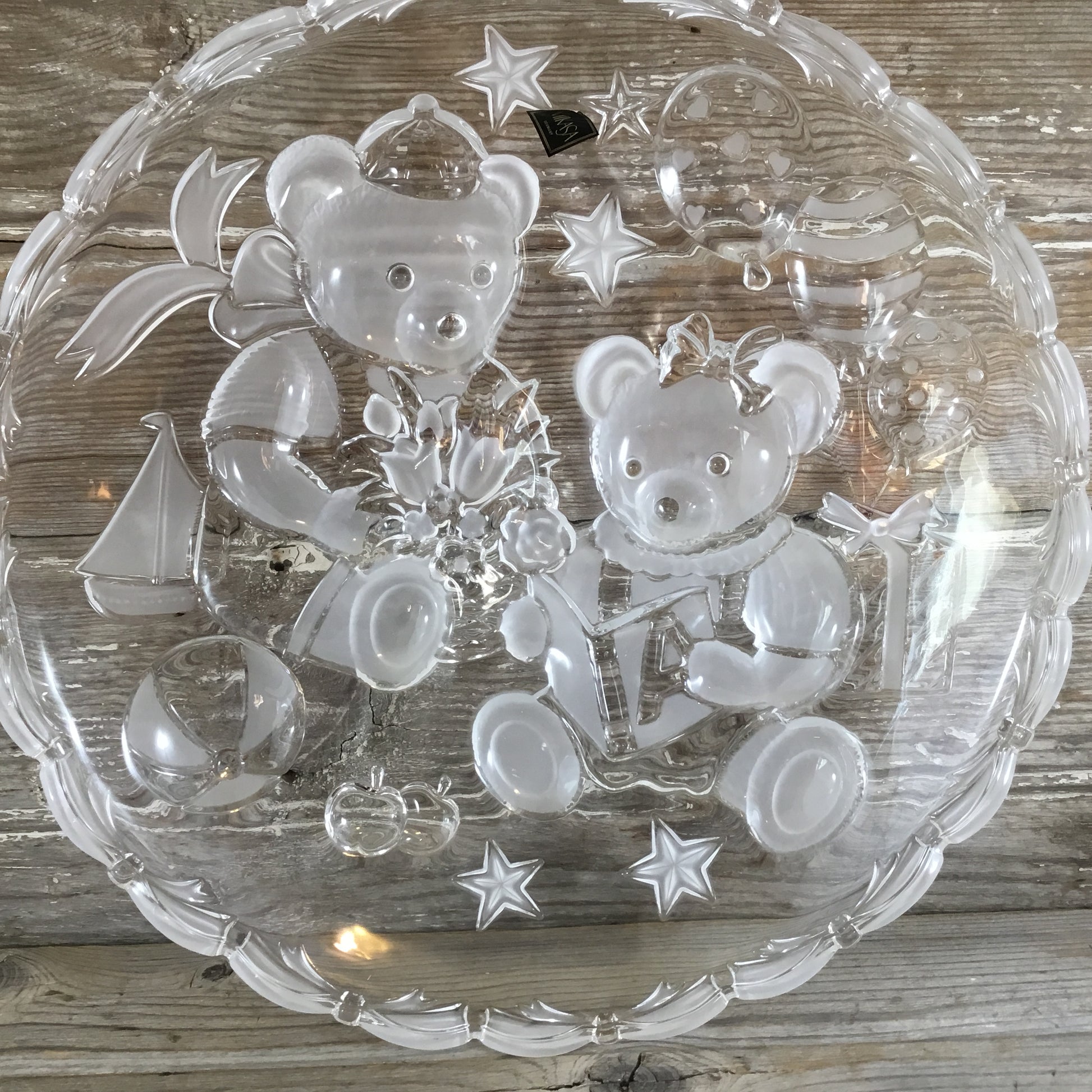 The plate is in good condition, still retaining its original sticker, ensuring its authenticity. The embossed frosted finish gives it a unique texture, making it a standout piece for any table setting. Whether you're hosting a birthday party, baby shower, or any special occasion, this platter is sure to impress your guests.