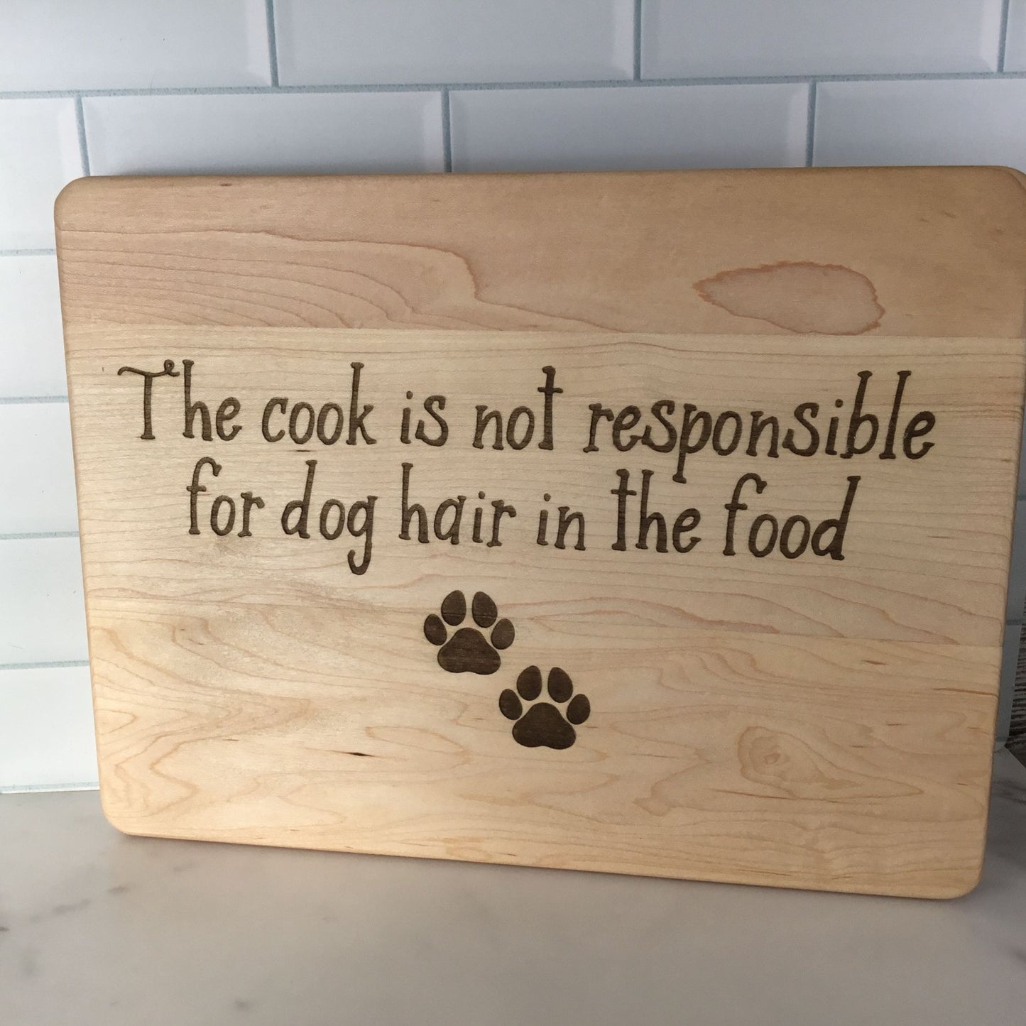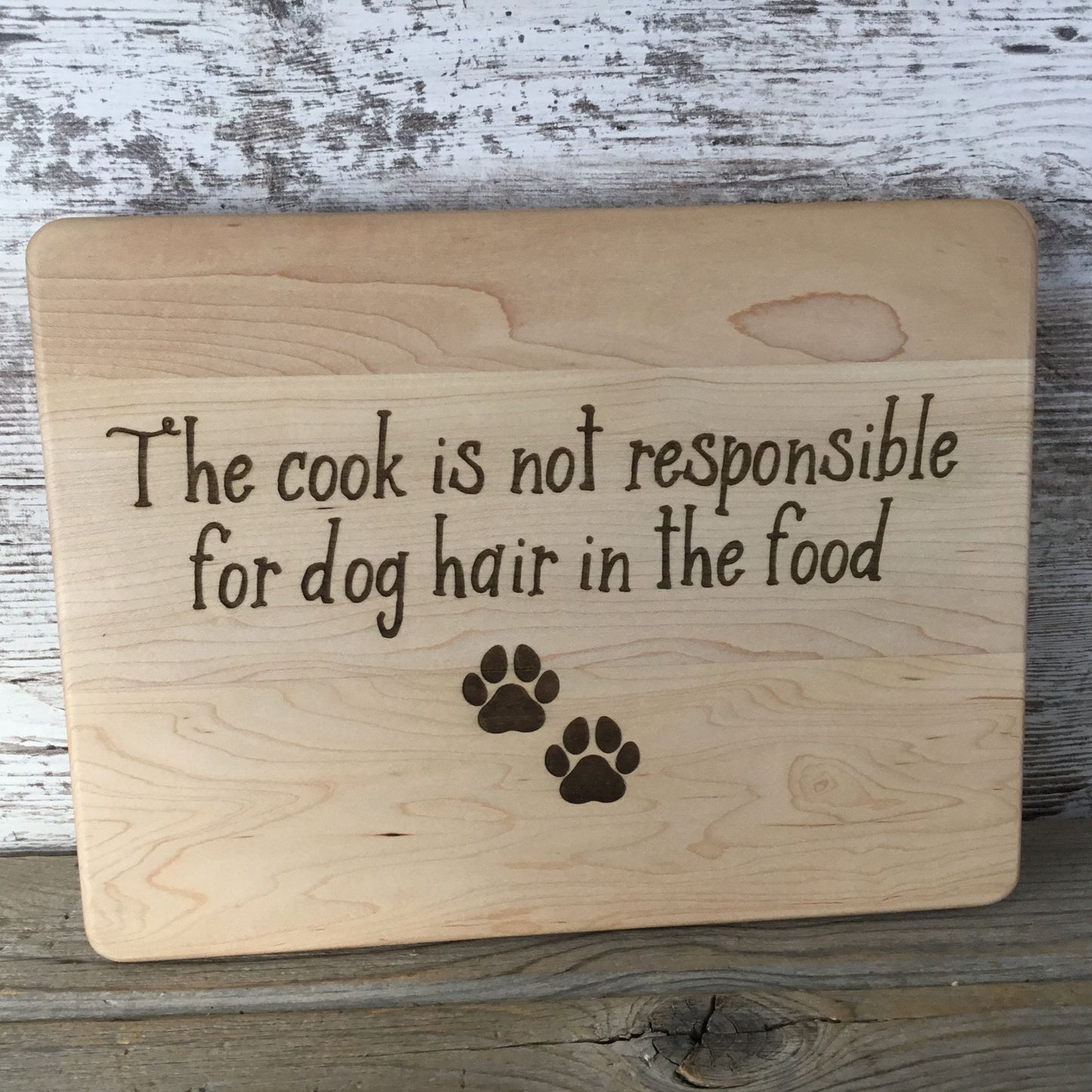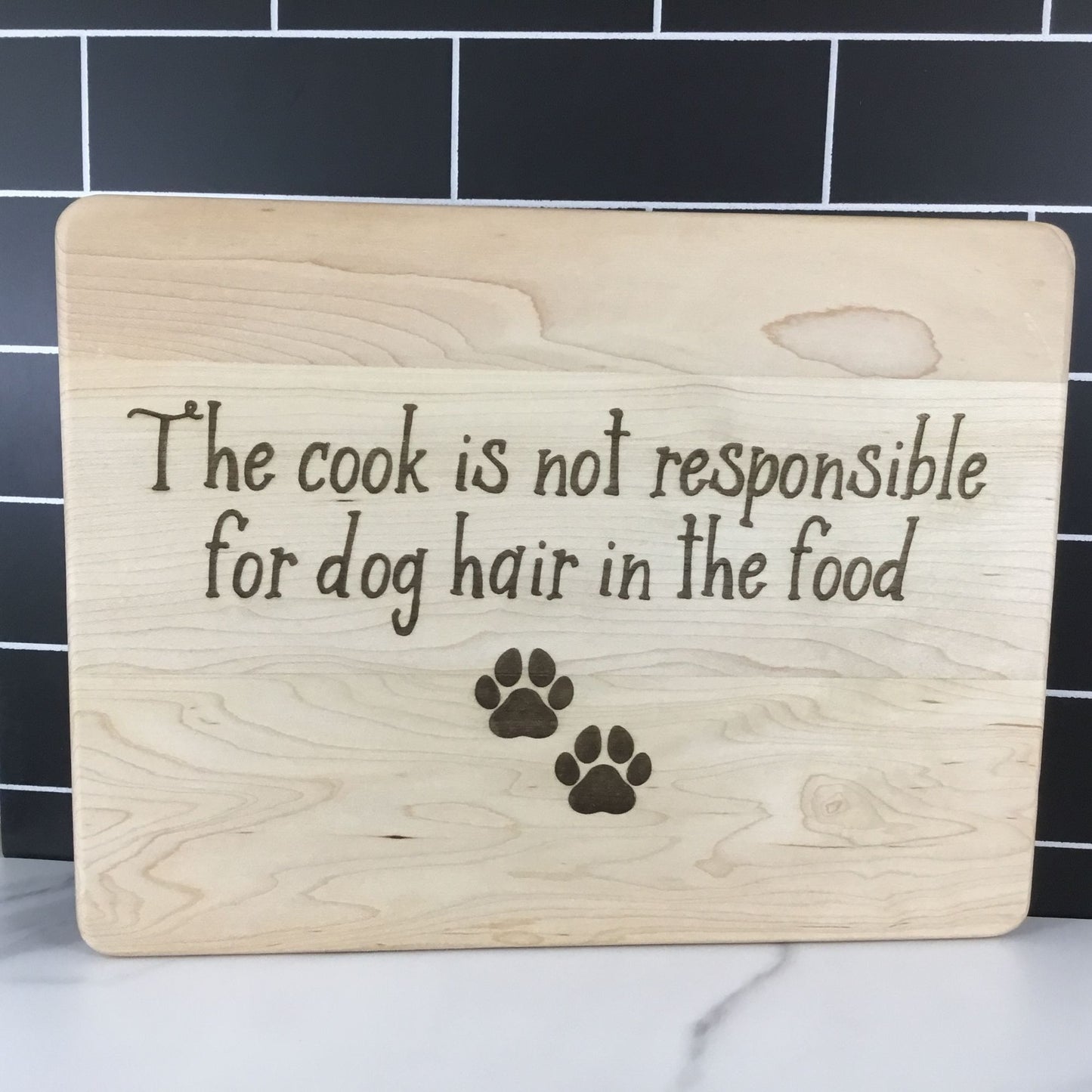 This 11.5" x 8.75" x 0.5" maple cutting board features a drip ring and paddle-style shape, crafted with both function and humor in mind. Laser engraved on the back is a cheeky reminder every dog owner can relate to: “The cook is not responsible for dog hair in the food” along with two pawprints. The engraving is on the back so the front remains fully usable for food prep. A fun and practical gift for pet lovers or anyone whose kitchen comes with a side of dog.