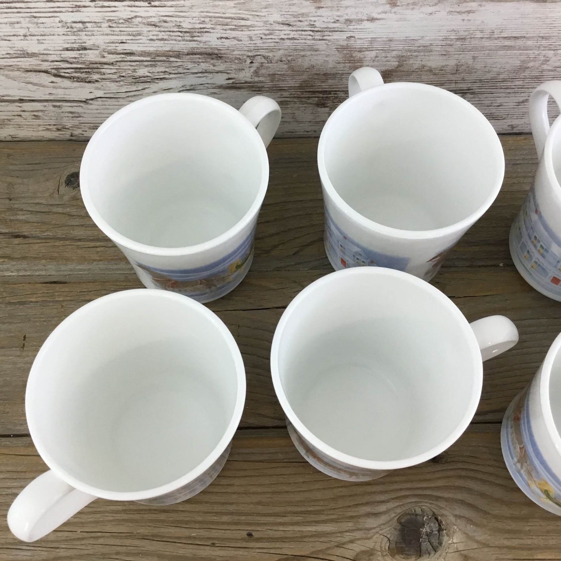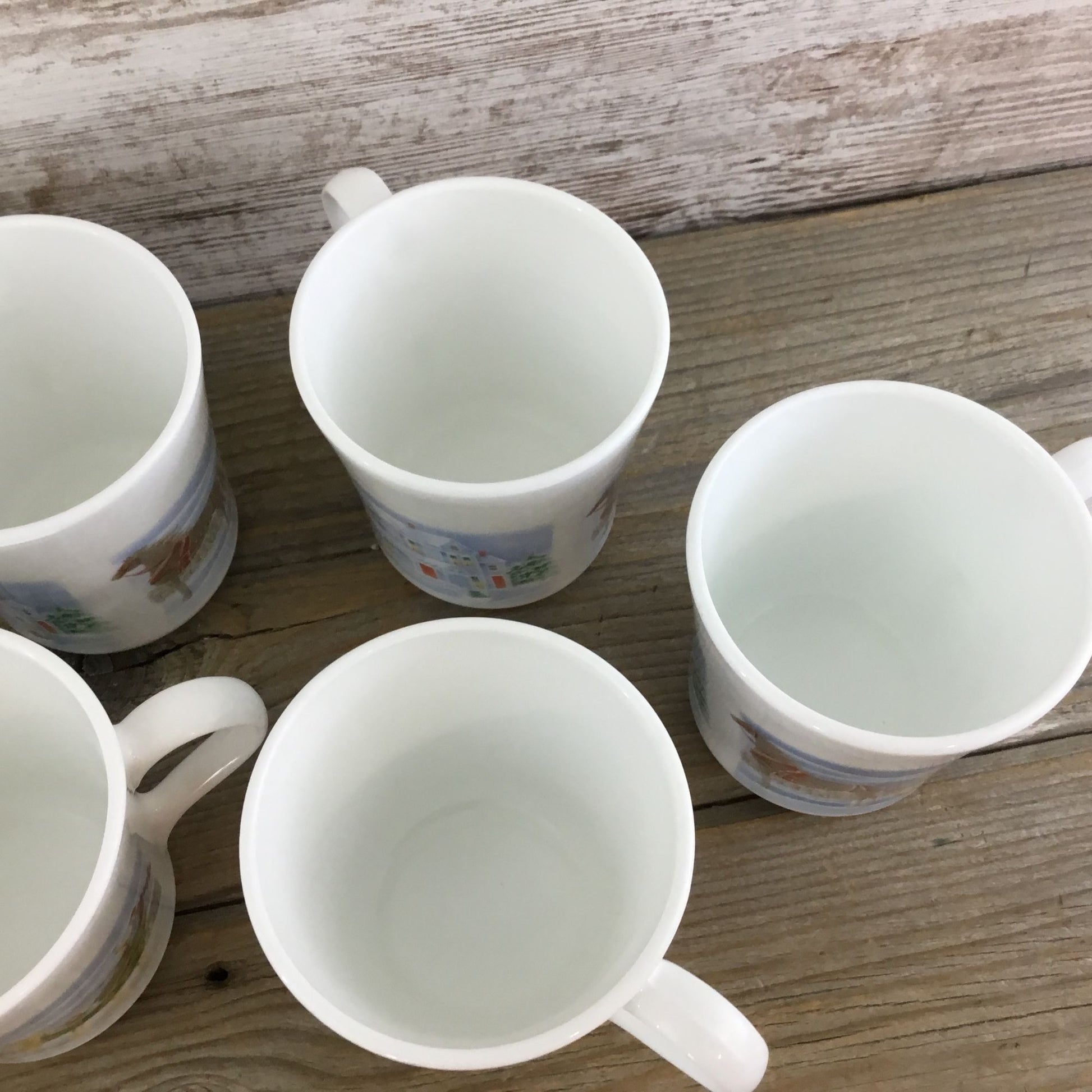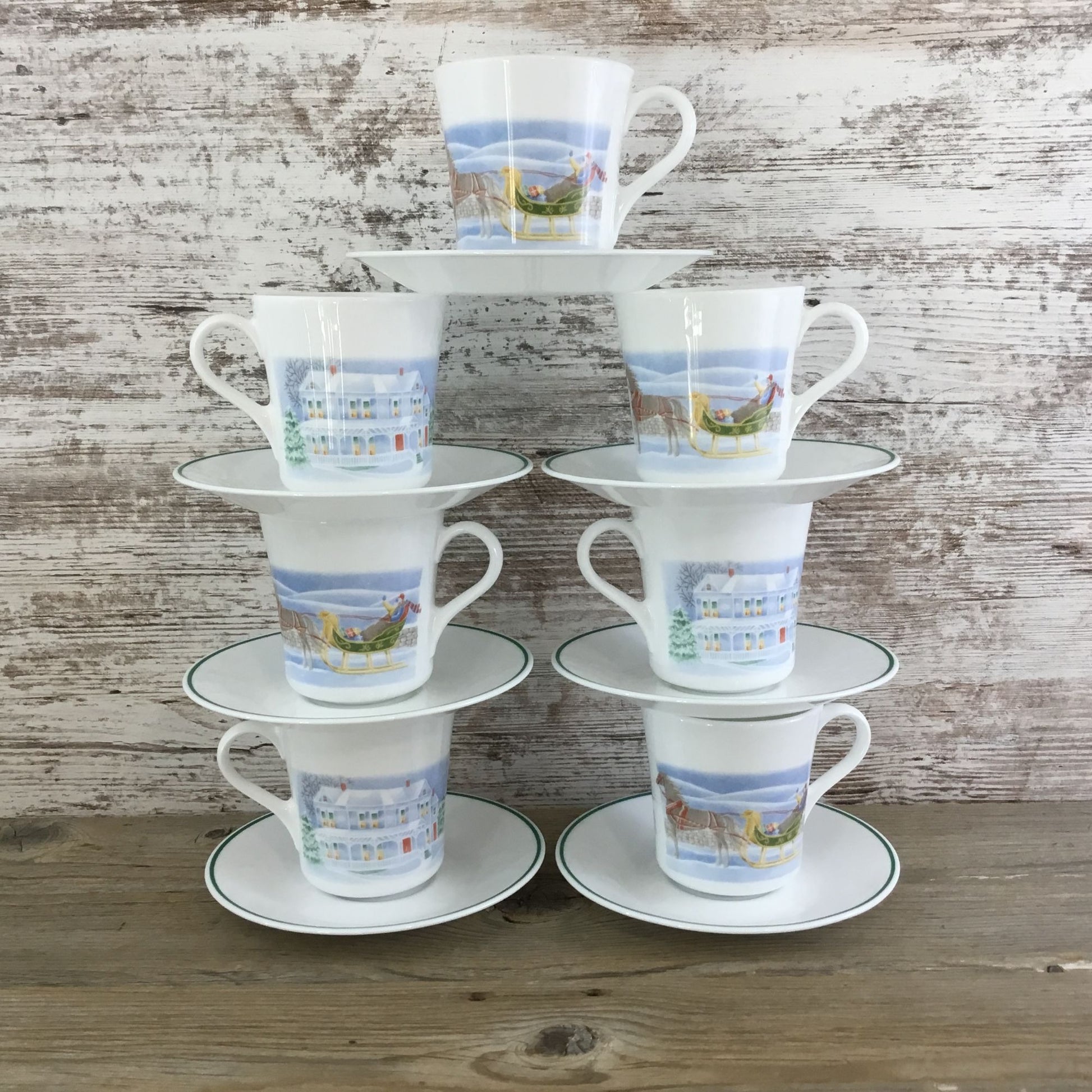 One Cup and One Saucer Corelle Country Memories Christmas horse and sleigh pattern. Each set includes one 9 oz cup and one 6¼" saucer. 7 sets available at time of listing. Very minor wear consistent with light use.