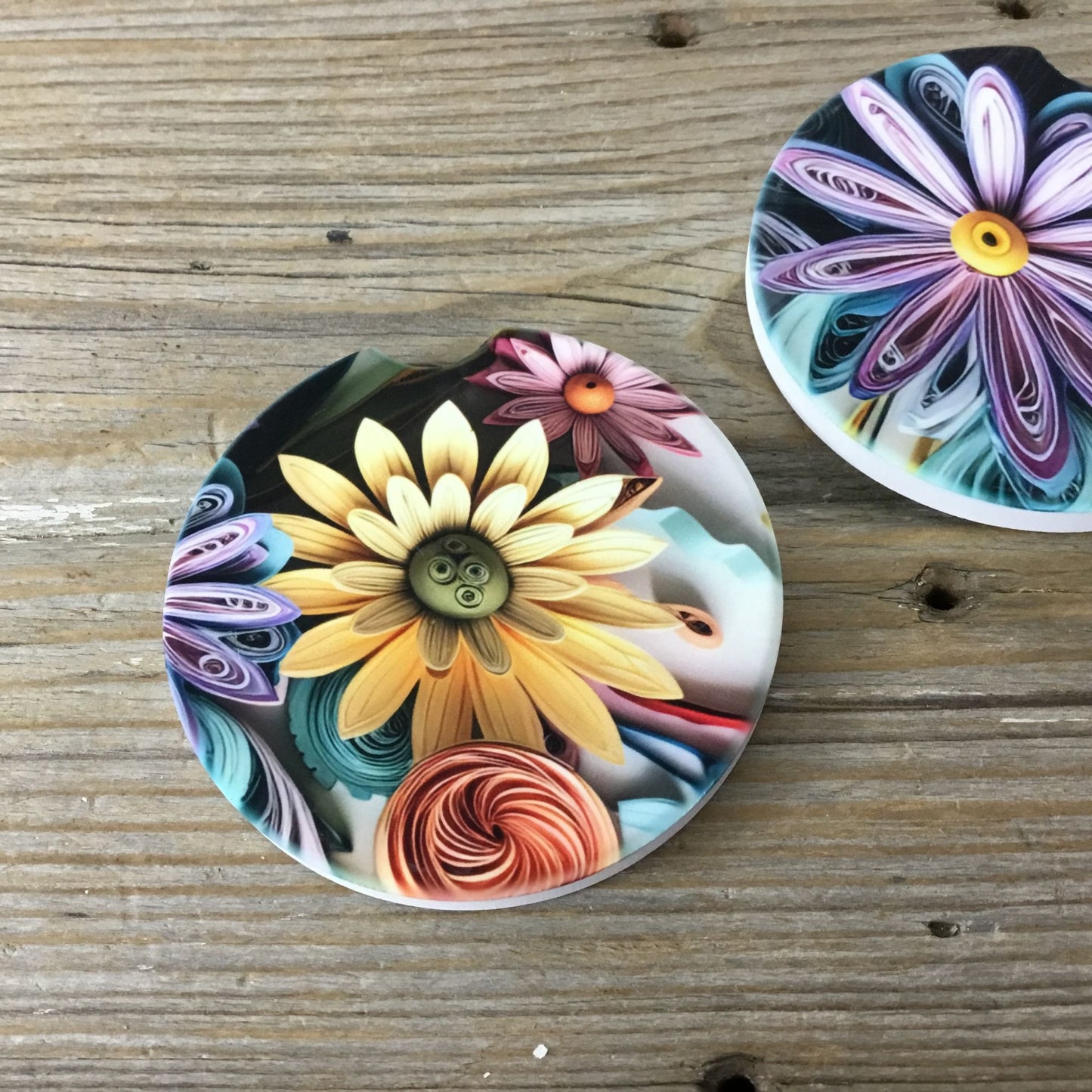 Pastel Paper Wildflowers Car Coasters Set of 2, a charming and functional addition to your car interior. Measuring 2.5 inches