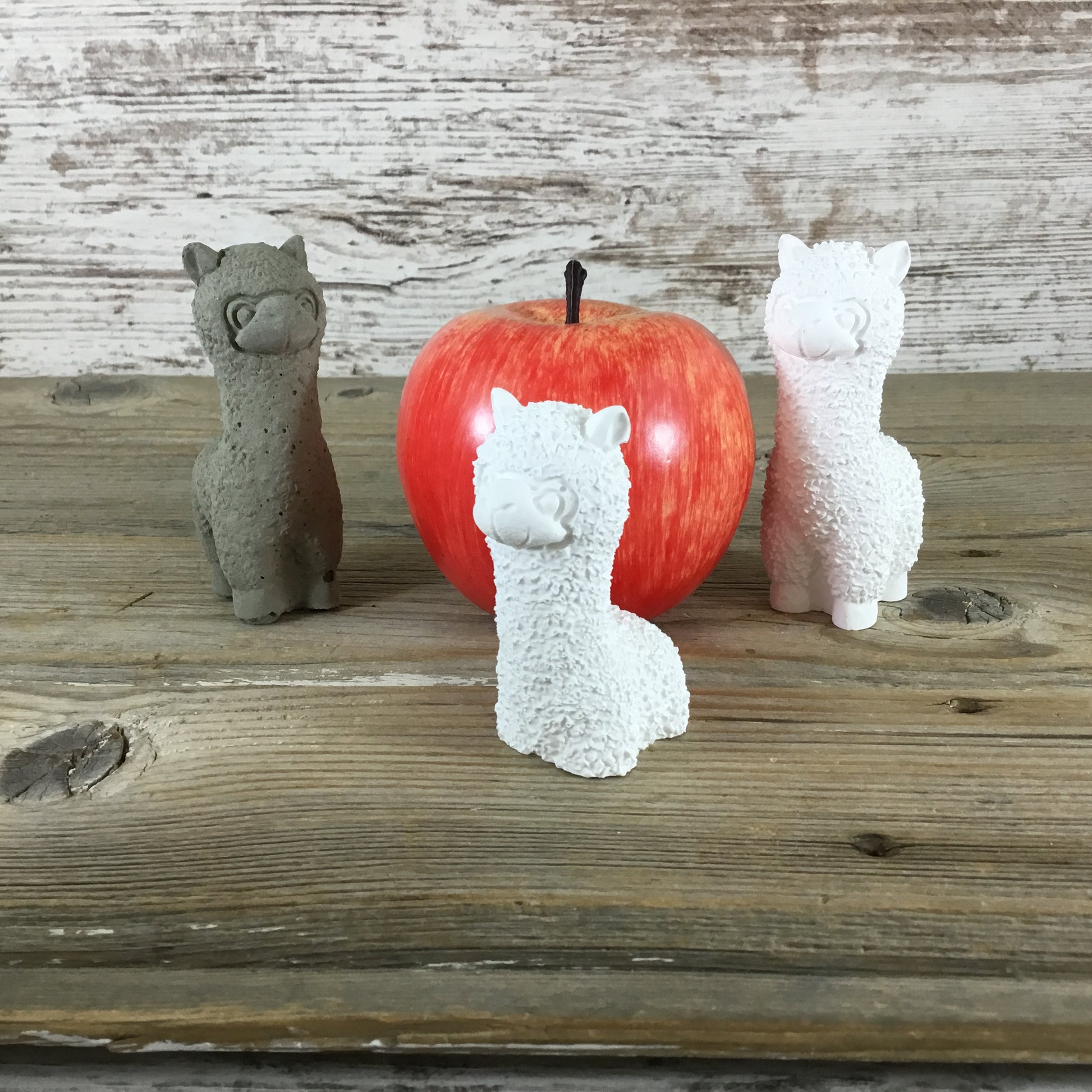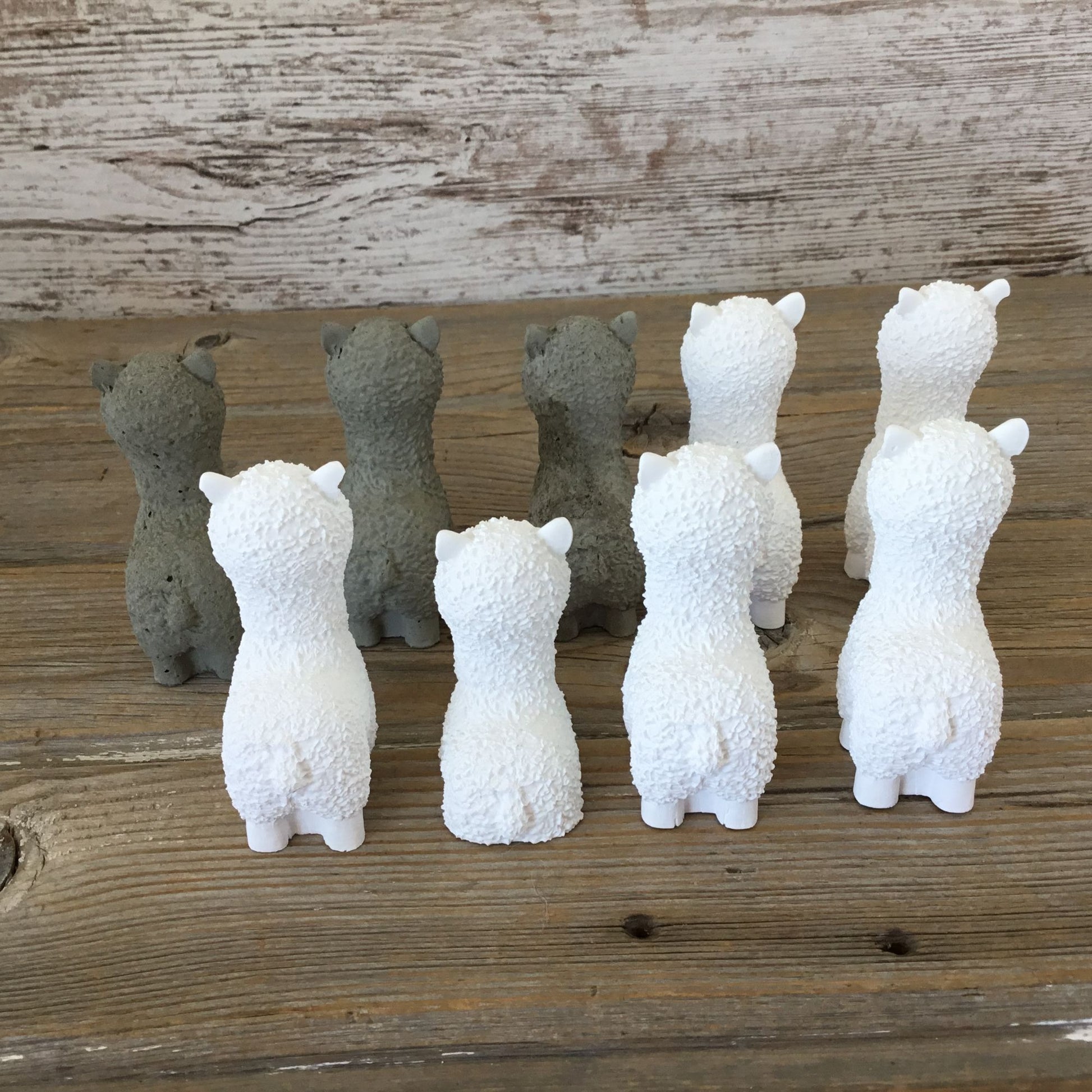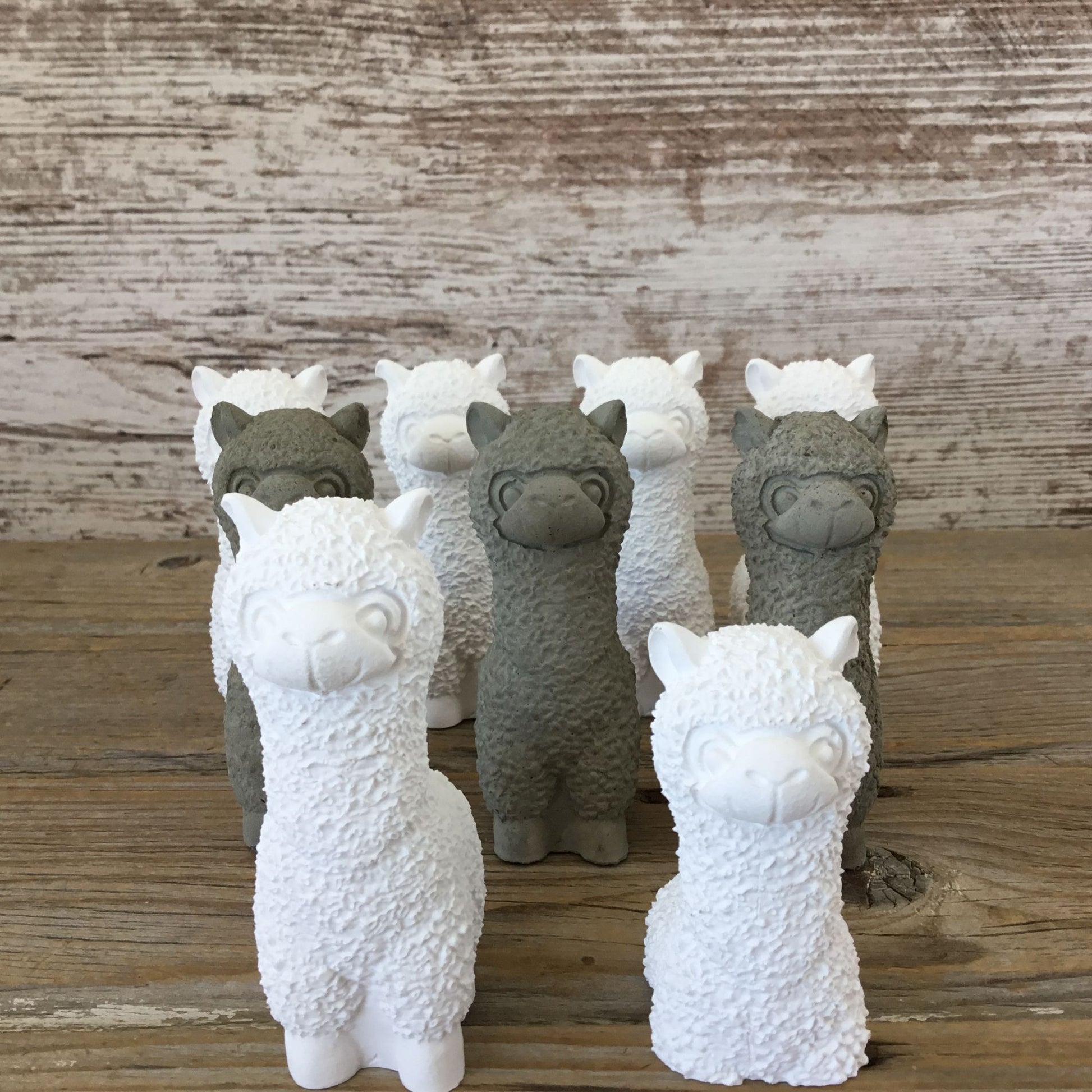 These alpacas were made while learning to mix and pour cement/ceramic resin. Each one is unique with small flaws, making them perfect for paint-your-own or DIY décor projects.