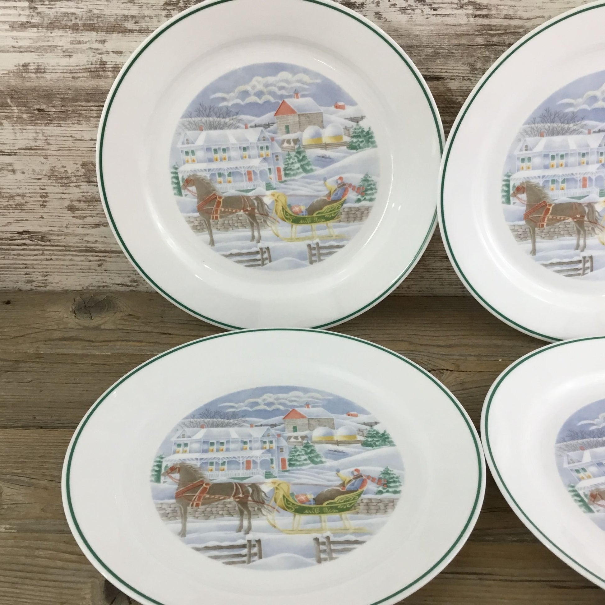 Set of four Corelle Country Memories dinner plates with the Christmas horse and sleigh design. Each measures 10¼". Very minor wear from light use. Two sets available at time of listing.