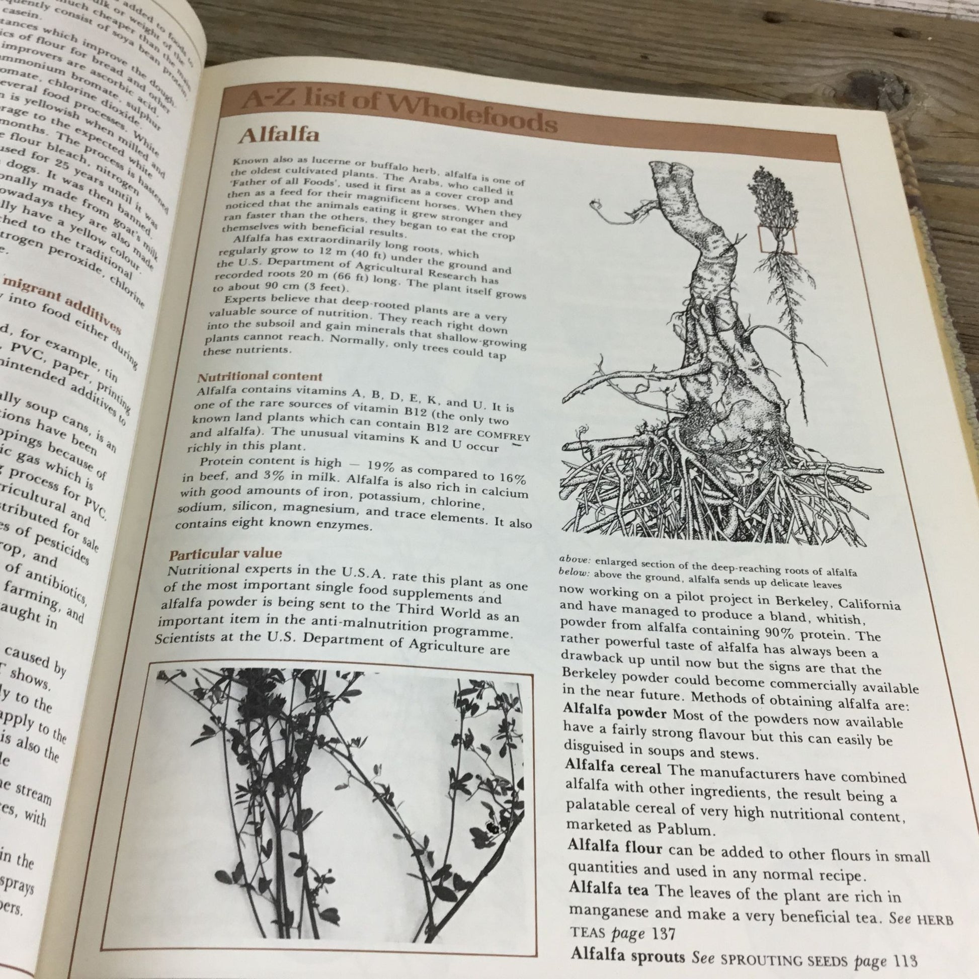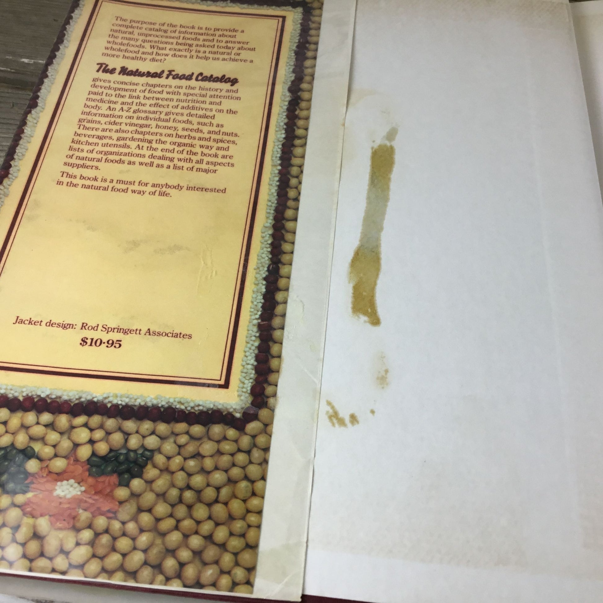 An informative guide on natural foods featuring recipes and resources. Includes a protective cover, is glued to inside back covers.
