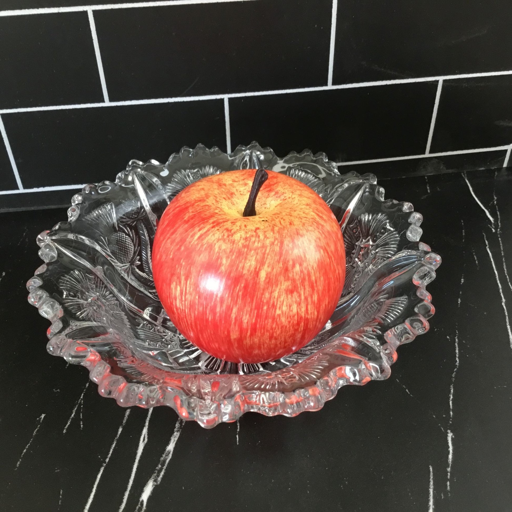 Dimensions: 6.5” diameter x 2.25” tall - apple for size comparison