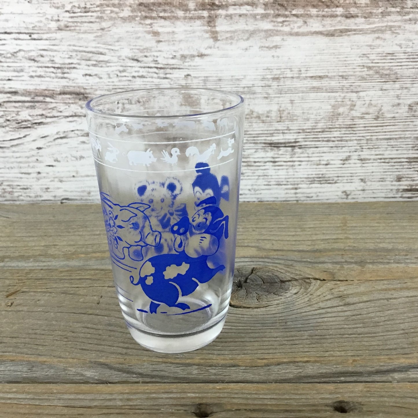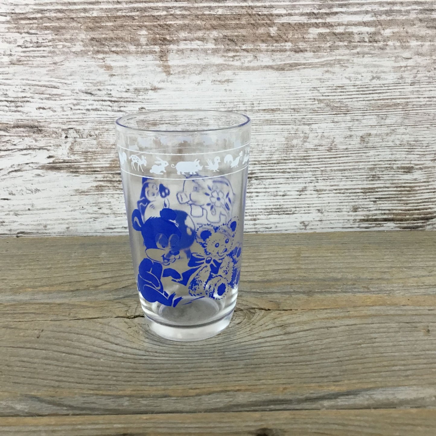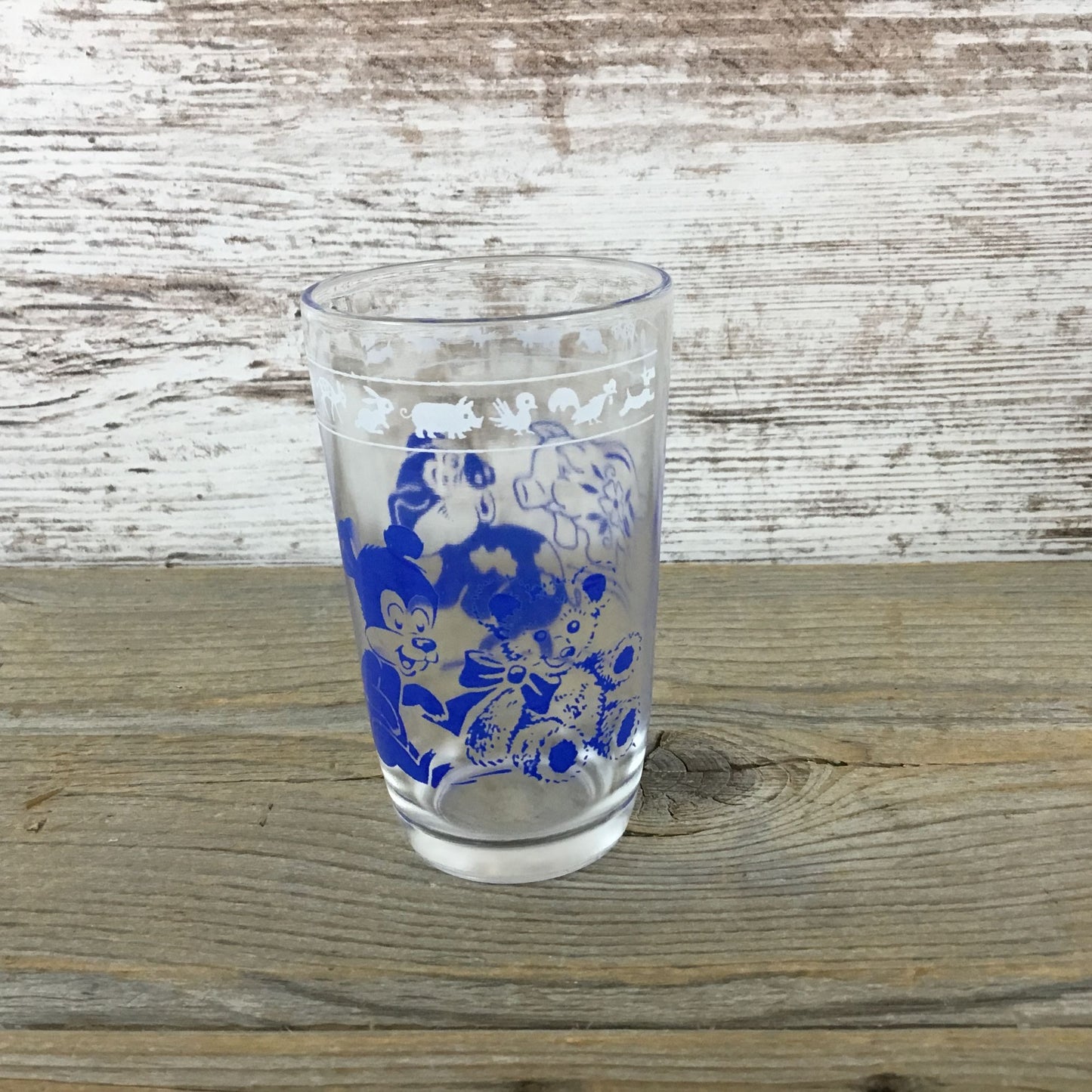 This glass features an adorable blue animal print—complete with cartoon-style bear, pig, and elephant illustrations—and a white silhouette animal band around the top. A nostalgic addition to any retro kitchen, glassware display, or Swanky Swig collection.