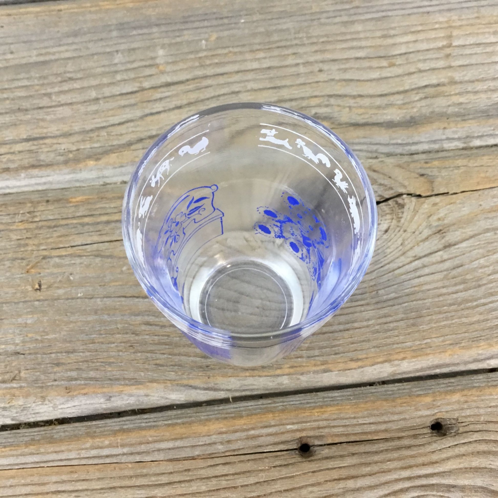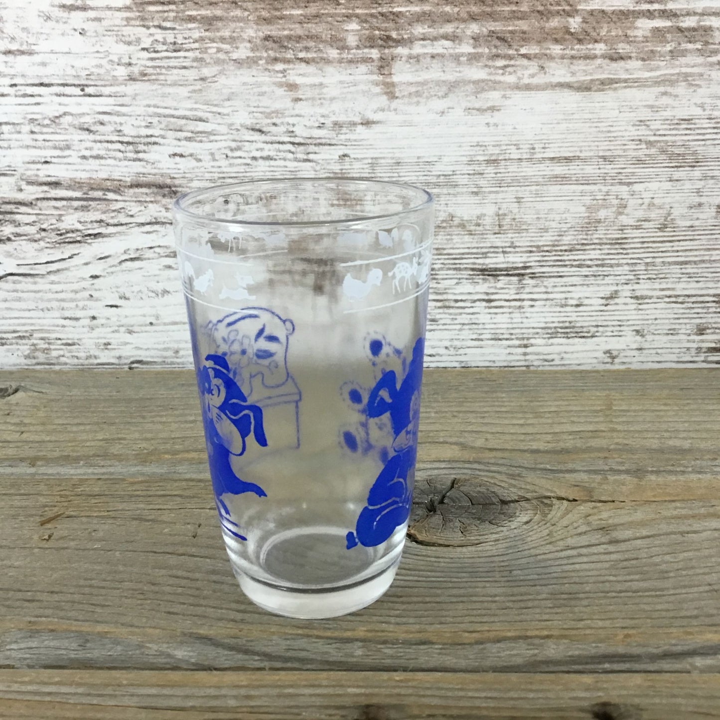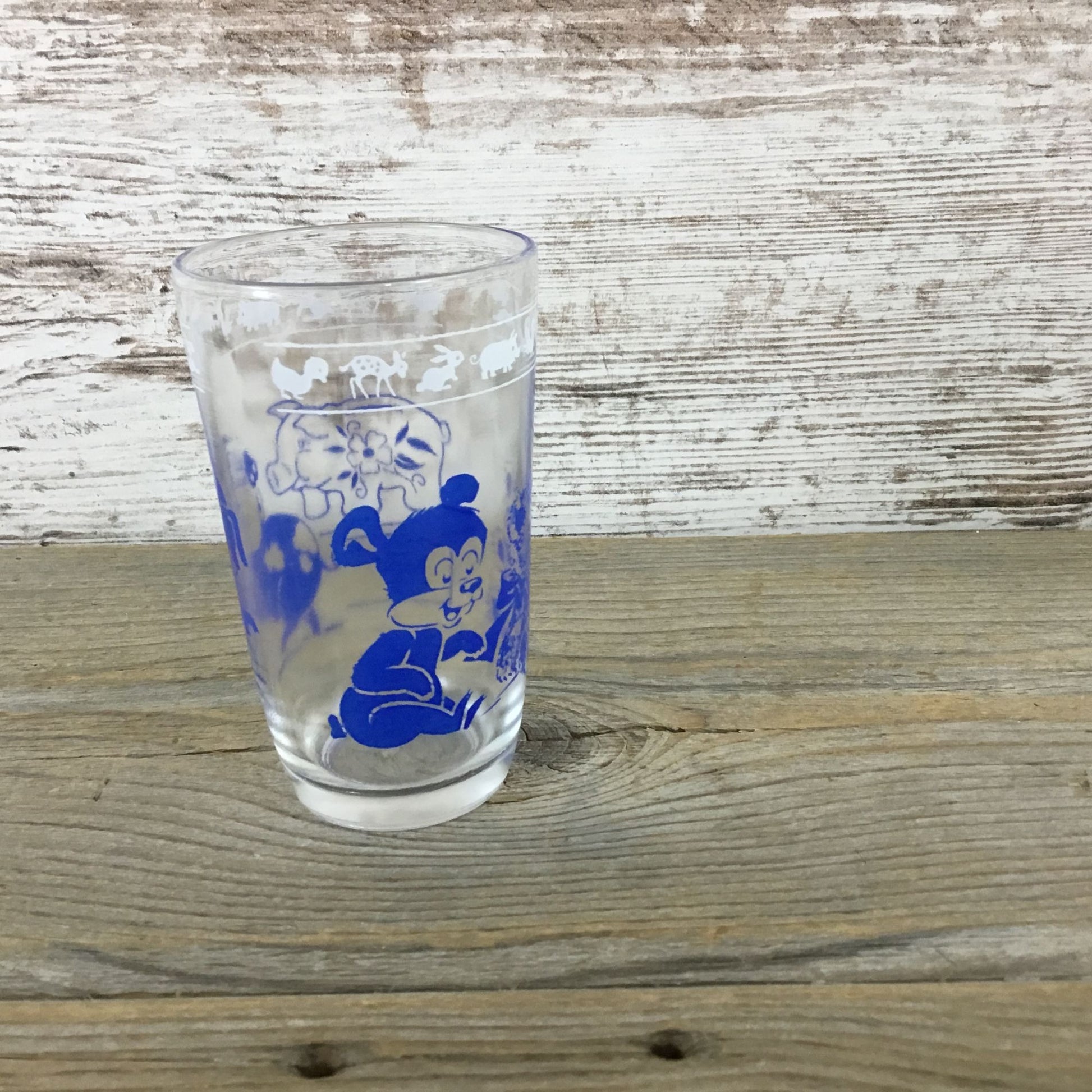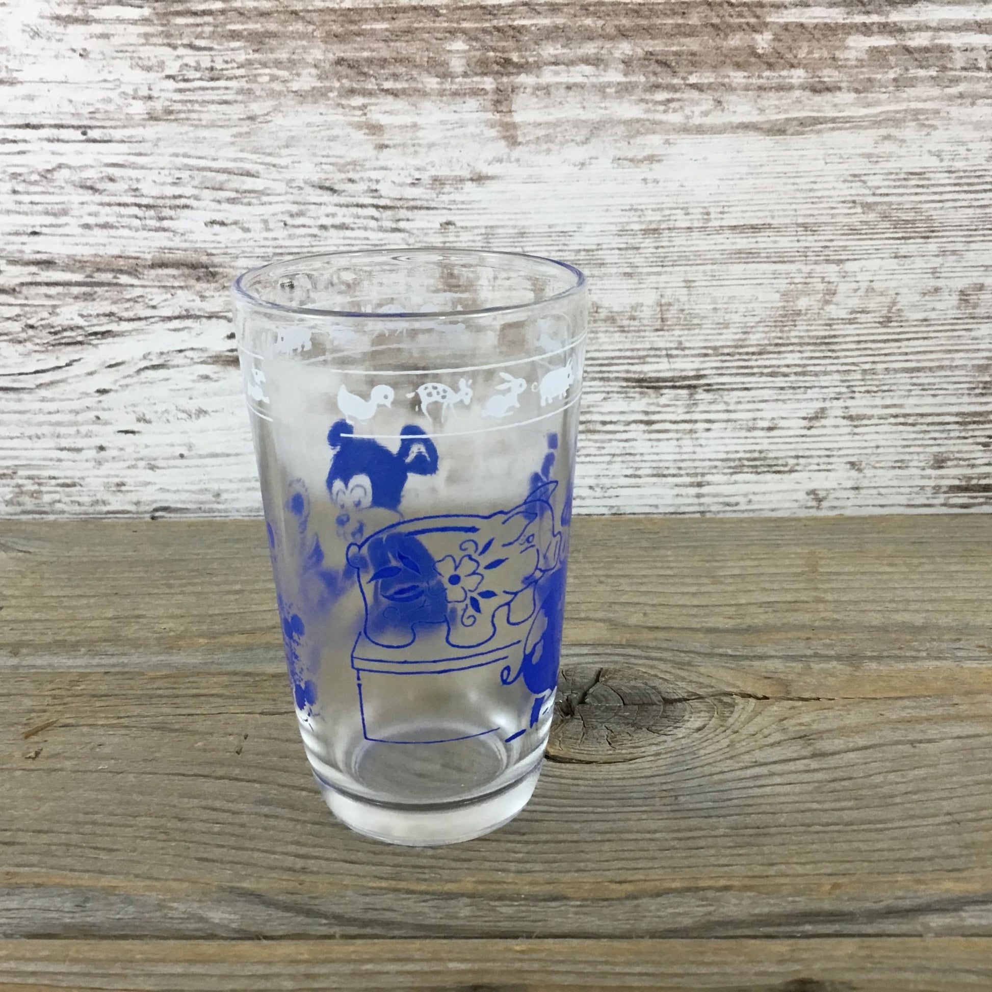 This glass features an adorable blue animal print—complete with cartoon-style bear, pig, and elephant illustrations—and a white silhouette animal band around the top. A nostalgic addition to any retro kitchen, glassware display, or Swanky Swig collection.