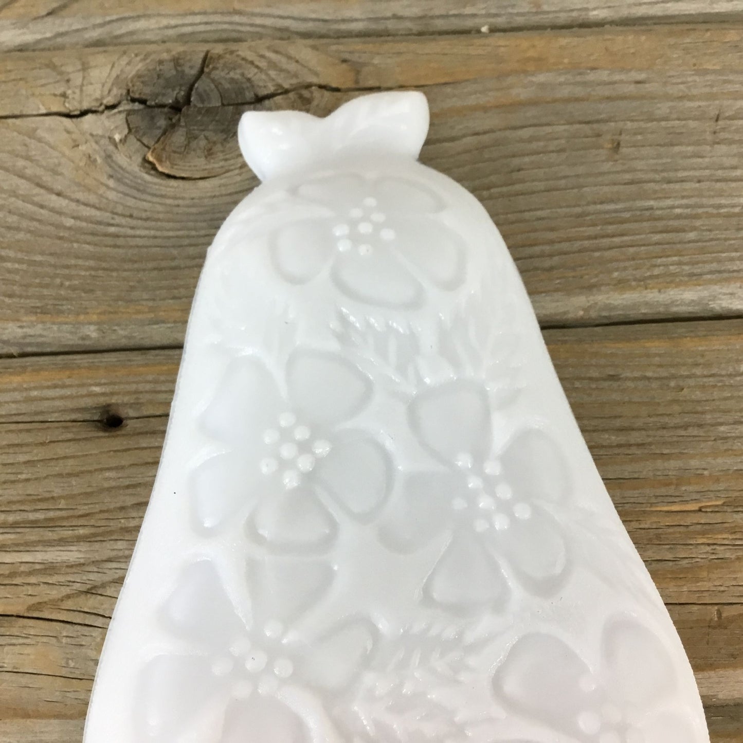 This white milk glass pear-shaped dish by Hazel Atlas is a lovely vintage piece, ideal for use as a trinket holder, ring dish, or even a candy or relish plate. Its fruit shape and classic milk glass finish make it a beautiful addition to both kitchen and vanity spaces.